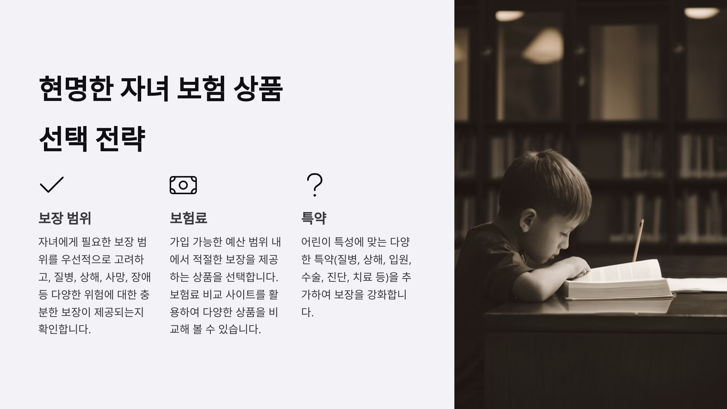 자녀 보험을 선택할 때는 단순히 보험료가 저렴한 것을 고르는 것이 아니라, 보장 범위와 혜택을 꼼꼼하게 따져봐야 해요. 아래의 기준을 참고하면 도움이 될 거예요.
