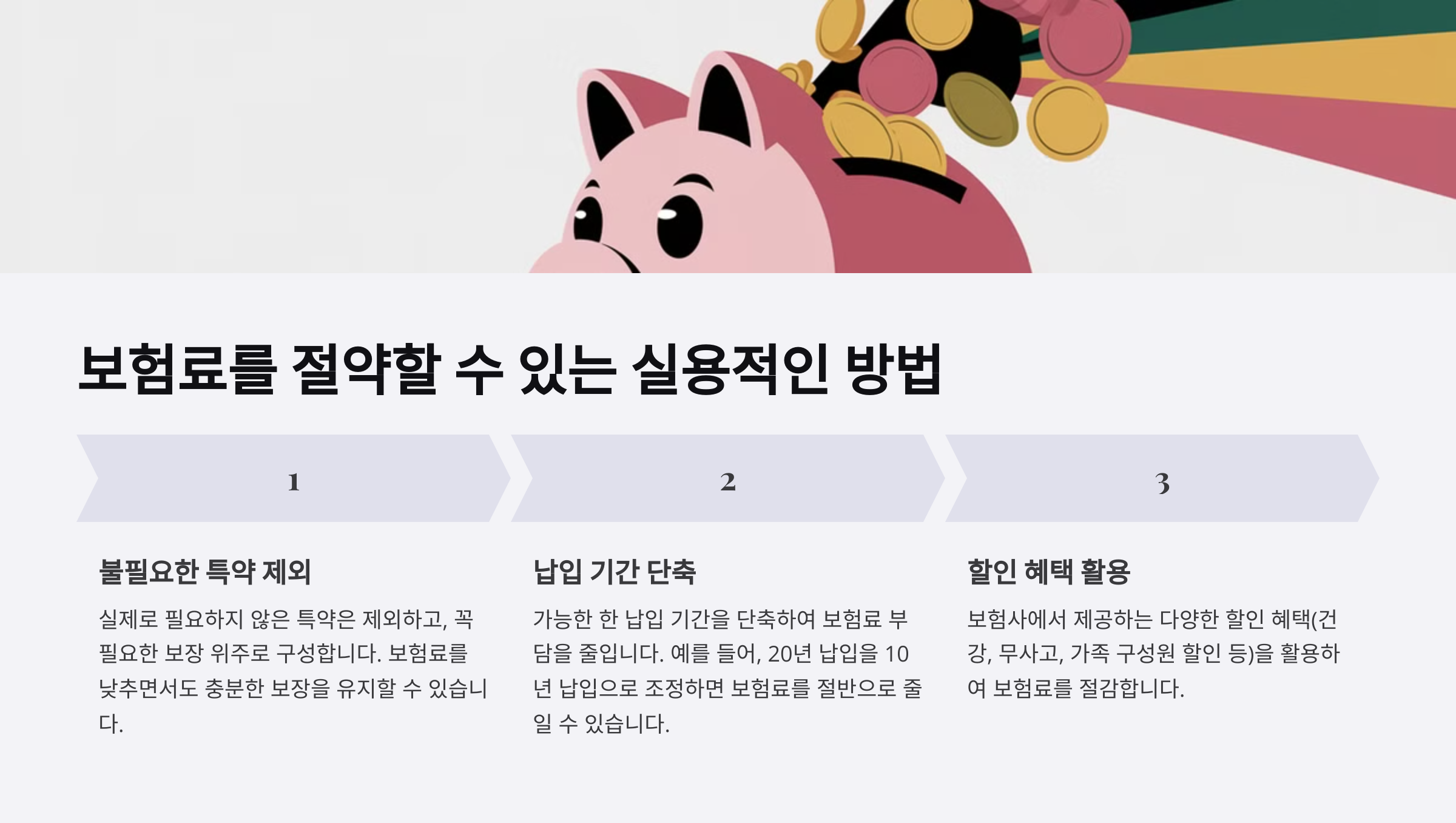 | 불필요한 특약 제외 | 필요한 보장만 선택하여 보험료 절감 |