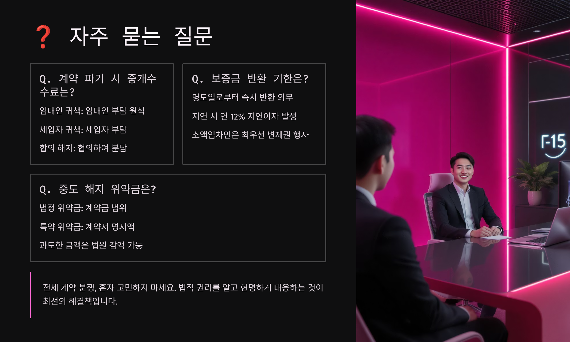 A8. 한국토지주택공사(LH) 주거복지센터, 대한법률구조공단, 주택임대차분쟁조정위원회에서 무료 상담을 받을 수 있어요. 서울시는 '전월세보증금지원센터'도 운영하고 있어요. 혼자 고민하지 말고 전문가의 도움을 받으세요! 😊