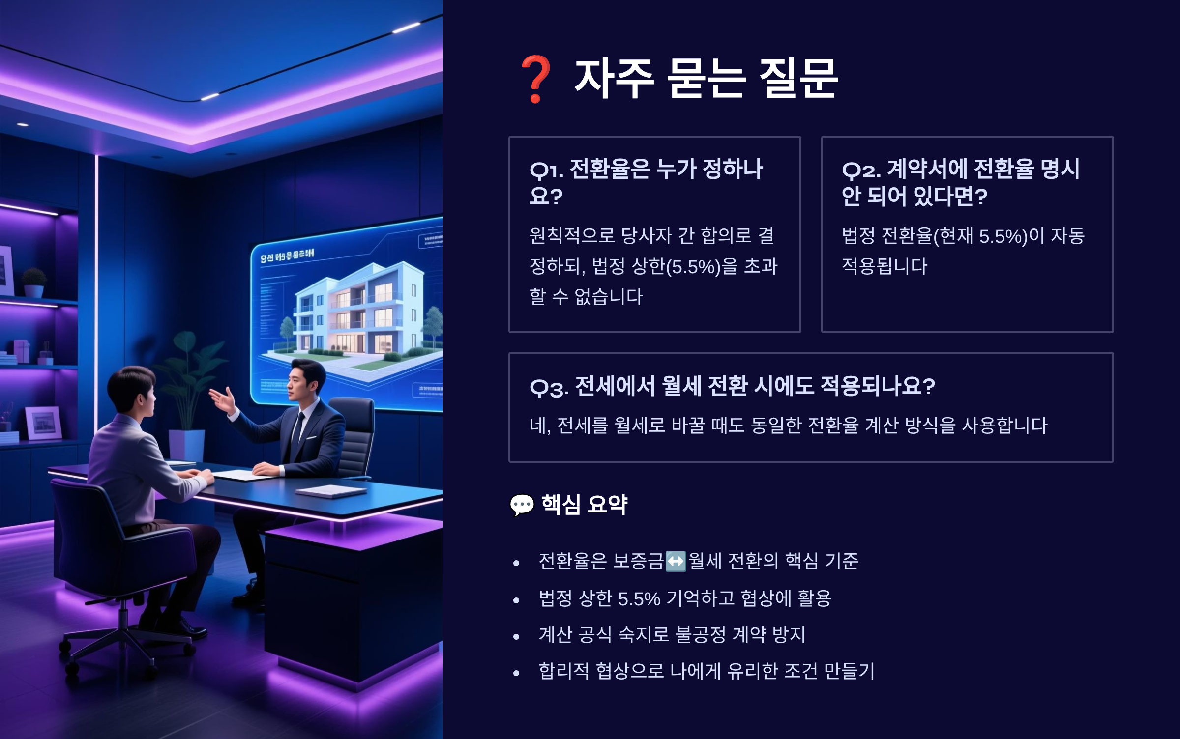 박 씨는 협상을 통해 전환율 7%로 합의했어요. 1억 원 × 7% ÷ 12 = 월 약 58만 원으로 계약하게 된 거죠. 법정 상한선보다 낮은 수준이라 박 씨에게 유리한 조건이에요. 이렇게 전환율 개념을 알면 협상에서 주도권을 가질 수 있답니다.