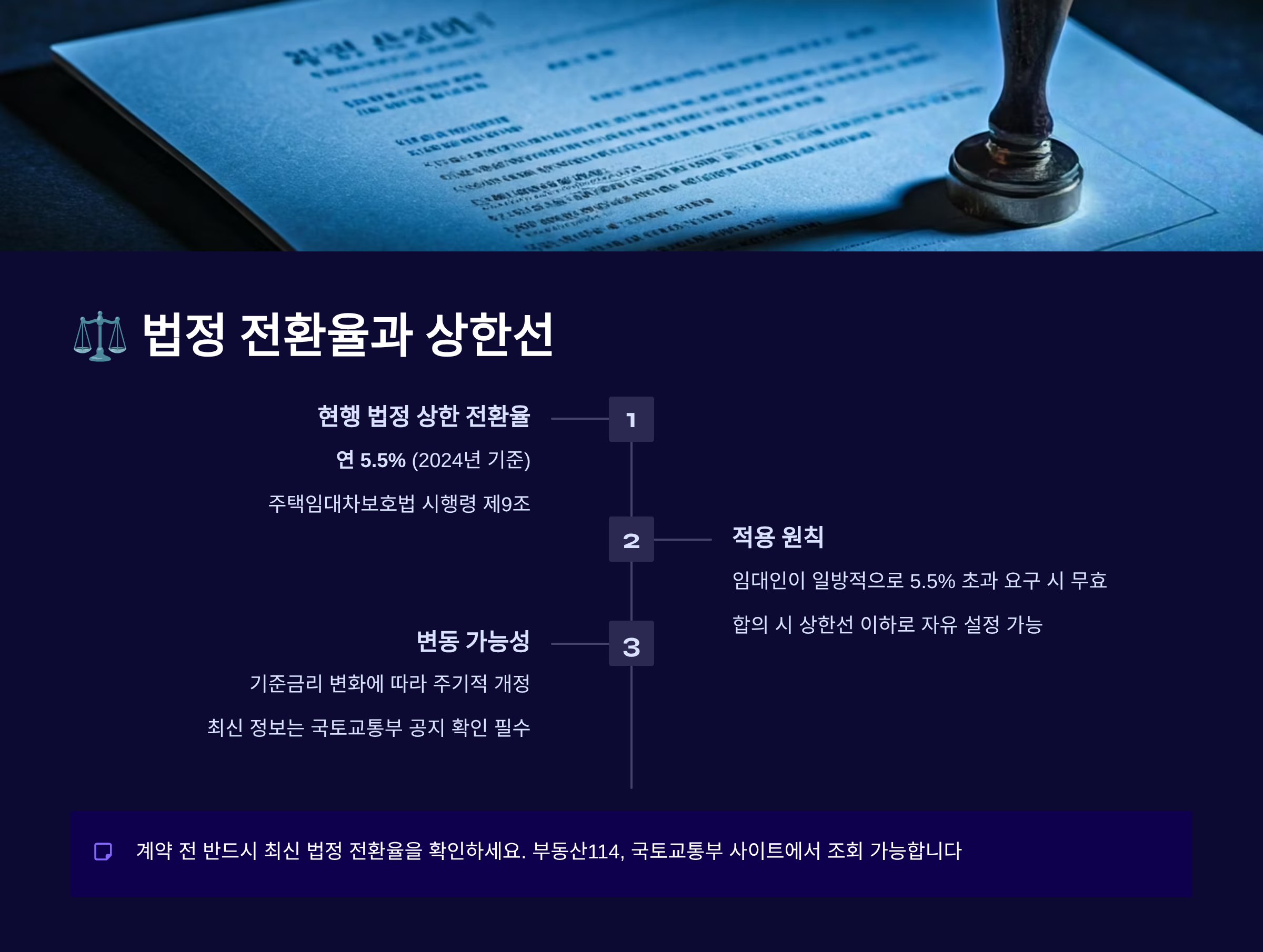 정부는 세입자 보호를 위해 법정 전환율 상한선을 정해두고 있어요. 2025년 현재 주택임대차보호법에 따르면, 전환율은 기준금리에 대통령령으로 정한 이율을 더한 비율을 초과할 수 없답니다. 현재 이 상한선은 연 10%로 적용되고 있어요.