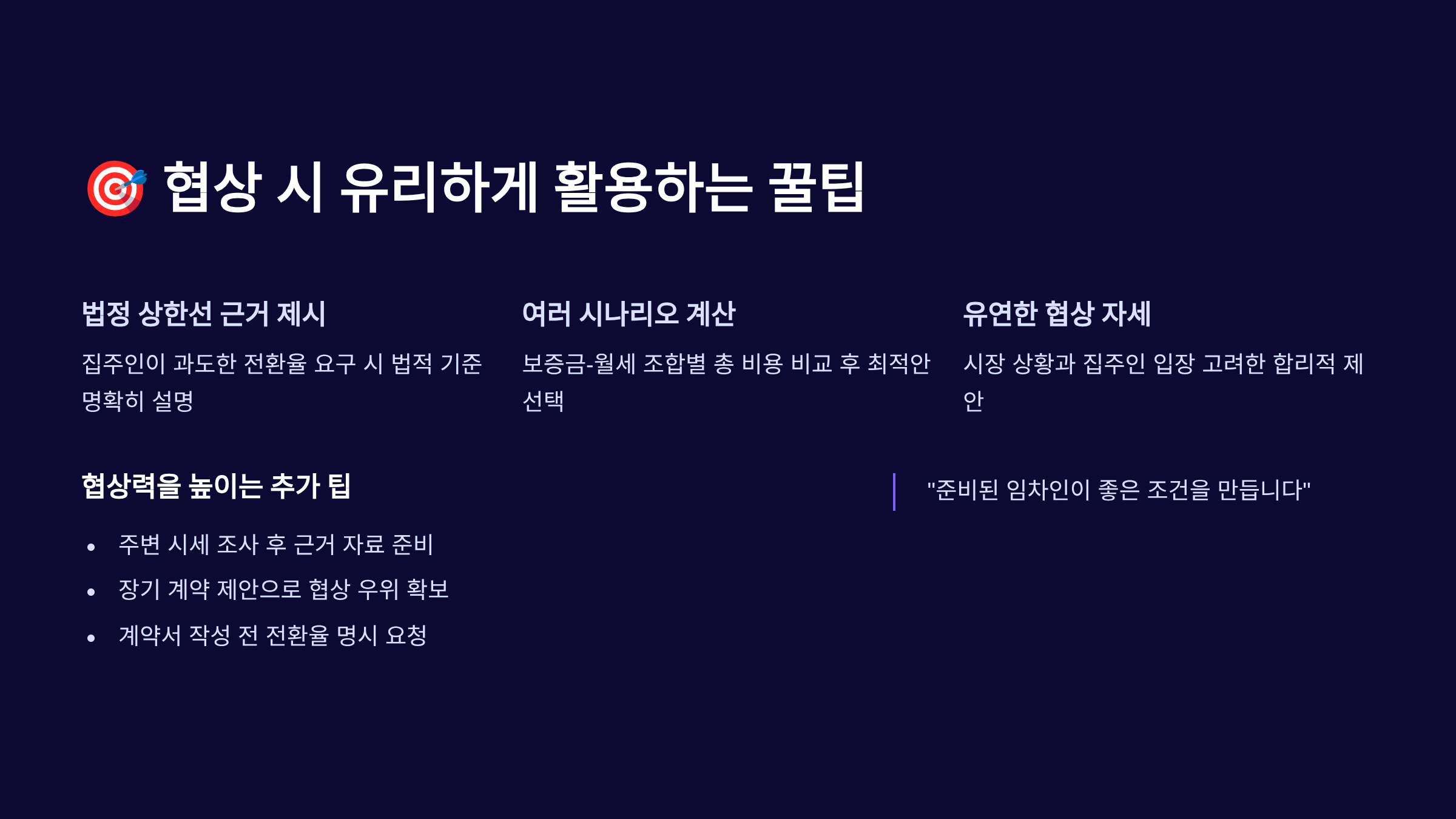 협상 테이블에서는 법정 상한선을 언급하는 게 효과적이에요. 집주인이 높은 전환율을 요구할 때, 법적으로 10%가 상한 이라는 점을 알려주면 대부분 태도가 달라져요. 법을 모르는 집주인도 있고, 알면서도 모르는 척하는 경우도 있거든요.