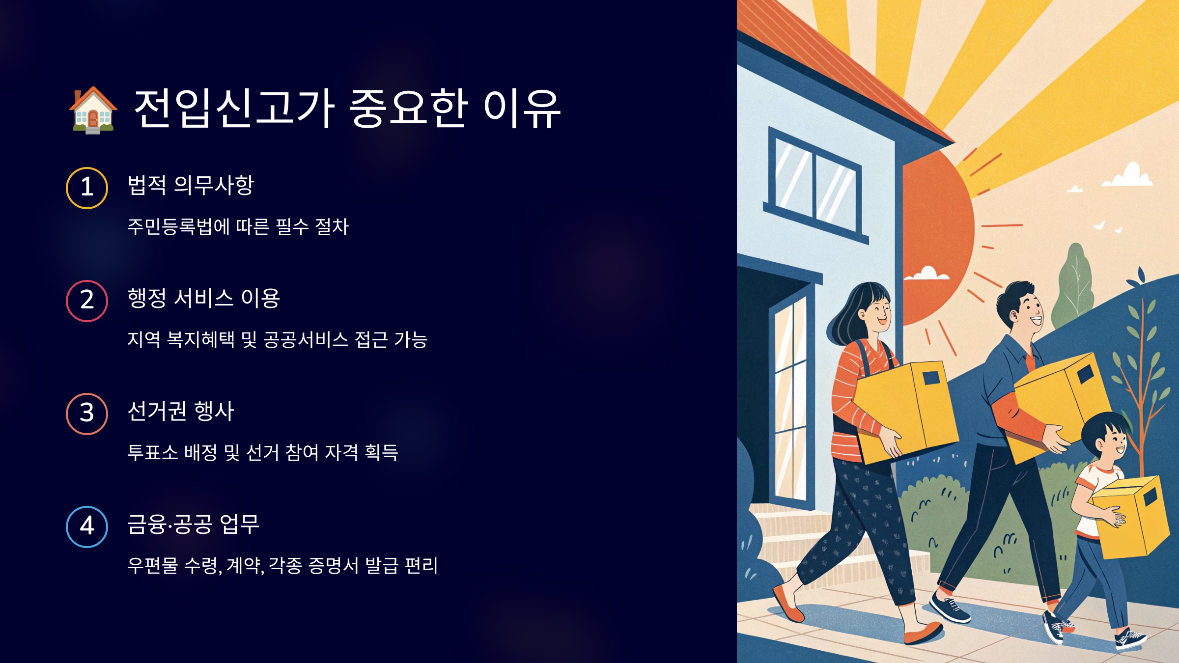 전입신고는 새로운 지역사회의 일원이 되는 중요한 첫걸음이에요. 단순한 의무사항이 아니라 시민으로서의 권리를 누리기 위한 필수 절차라고 생각하면 좋을 것 같아요! 🏠