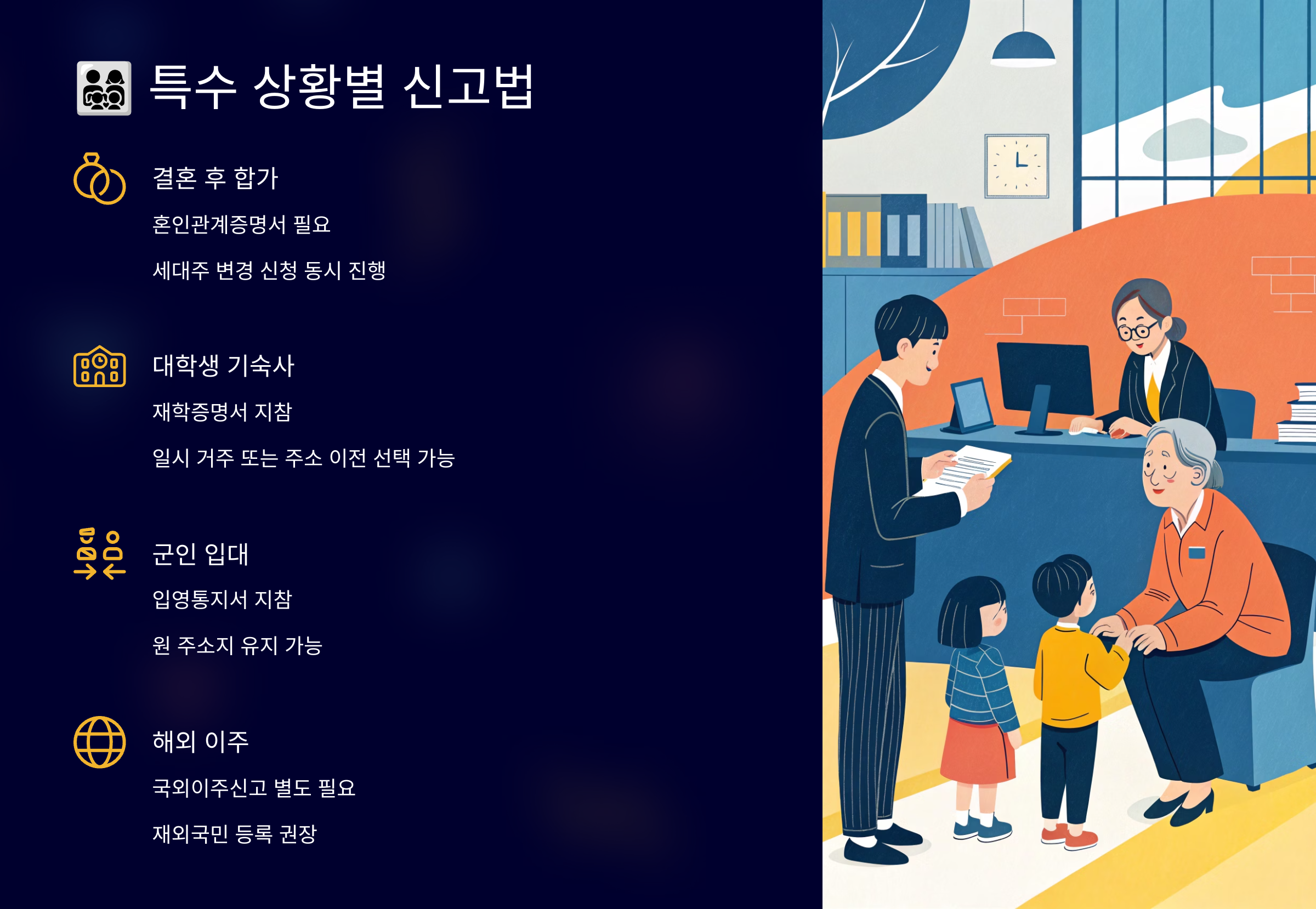 일반적인 경우와 다른 특수한 상황에서의 전입신고는 추가적인 서류나 절차가 필요할 수 있어요. 먼저 외국인이나 다문화 가정의 경우를 살펴보면, 외국인등록증이나 거소신고증, 혼인신고서 등의 추가 서류가 필요해요. 특히 한국인과 결혼한 외국인의 경우 혼인관계증명서와 함께 배우자의 동의서도 필요할 수 있어요. 언어 장벽이 있다면 주민센터에서 통역 서비스를 요청할 수도 있답니다.