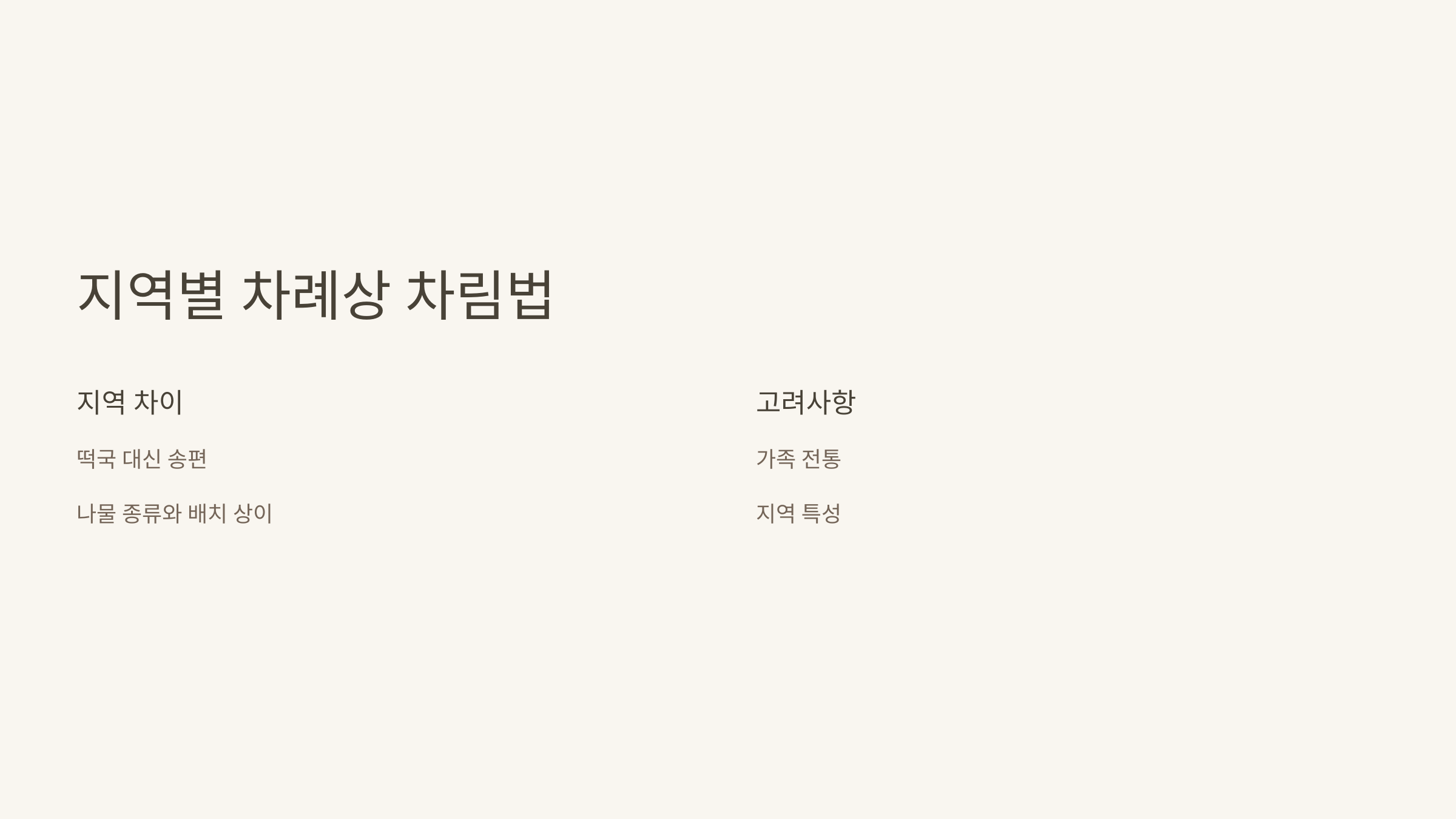 차례상 차림법은 지역마다 조금씩 다를 수 있습니다. 예를 들어, 일부 지역에서는 떡국 대신 송편을 올리기도 하고, 나물의 종류나 배치가 다를 수 있습니다. 이러한 차이는 지역의 문화와 전통에 따라 달라지며, 각 가정의 고유한 방식이기도 합니다. 따라서 차례상을 차릴 때는 가족의 전통과 지역의 특성을 고려하는 것이 중요합니다. 이는 조상님을 향한 존경의 표현이기도 하며, 가족 간의 유대감을 강화하는 데에도 큰 역할을 합니다.