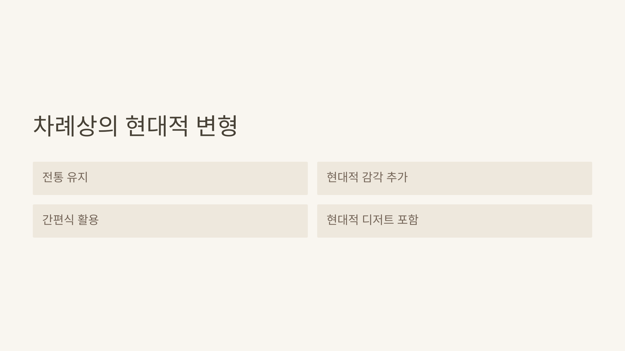 현대에는 차례상 차림법도 조금씩 변형되고 있습니다. 전통적인 방식에 현대적인 감각을 더해, 보다 간편하게 차례상을 준비하는 가정도 늘고 있습니다. 예를 들어, 전통적인 음식을 대신해 현대적인 디저트를 올리거나, 간편식으로 준비하는 경우도 있습니다. 이러한 변화는 바쁜 현대인의 생활에 맞춰진 것이지만, 여전히 조상님께 대한 존경과 가족 간의 유대감을 잊지 않는 것이 중요합니다.