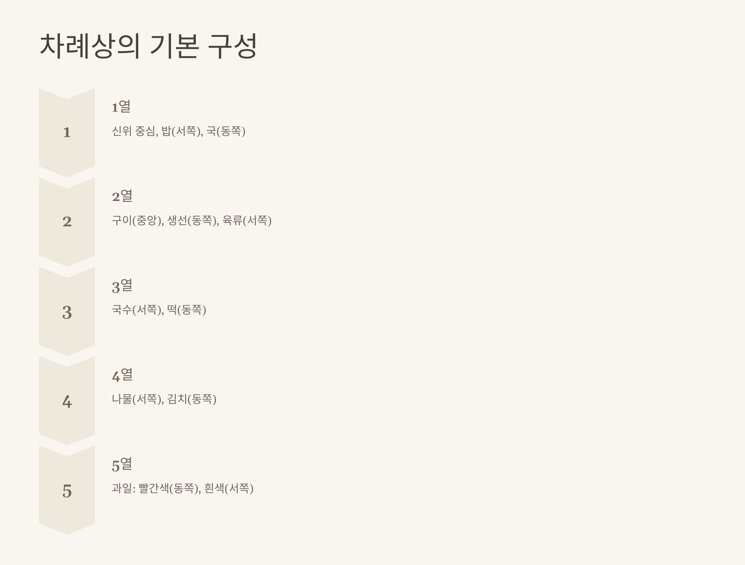 차례상은 보통 5열로 구성되며, 신위가 있는 쪽을 1열로 봅니다. 첫 번째 열에는 신위를 중심으로 밥과 국을 놓습니다. 밥은 서쪽에, 국은 동쪽에 놓는 것이 일반적입니다. 설날에는 떡국을 대신 올리기도 하죠. 두 번째 열에는 구이를 중앙에 놓고, 생선은 동쪽에, 육류는 서쪽에 놓습니다. 생선의 머리는 동쪽으로, 꼬리는 서쪽으로 향하게 놓습니다. 세 번째 열에는 국수와 떡을 올리며, 국수는 서쪽, 떡은 동쪽에 배치합니다. 네 번째 열은 나물과 김치로 구성되며, 익힌 나물은 서쪽, 생김치는 동쪽에 놓습니다. 마지막 다섯 번째 열에는 과일을 놓습니다. 빨간색 과일은 동쪽, 흰색 과일은 서쪽에 배치하는 것이 일반적입니다.