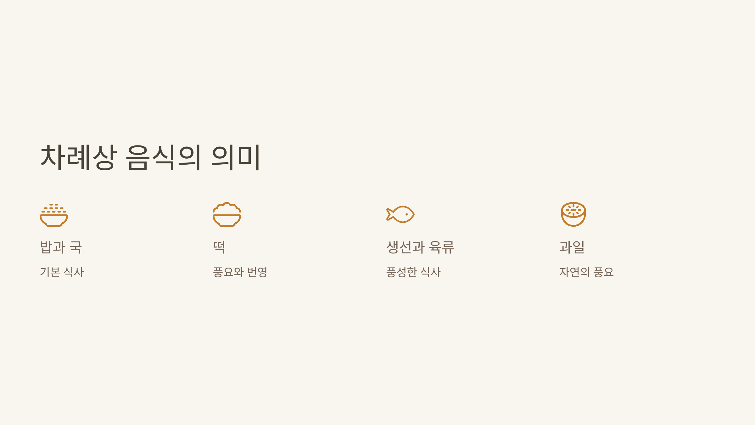 차례상에 올리는 각 음식은 고유한 의미를 가지고 있습니다. 예를 들어, 밥과 국은 조상님께 드리는 기본적인 식사로서의 의미를 지니고 있으며, 떡은 풍요와 번영을 기원하는 의미가 있습니다. 생선과 육류는 조상님께 풍성한 식사를 제공한다는 의미를 가지고 있으며, 과일은 자연의 풍요로움을 상징합니다. 이러한 음식들은 조상님께 드리는 마음의 표현이자, 가족에게도 그 의미를 전하는 중요한 역할을 합니다.