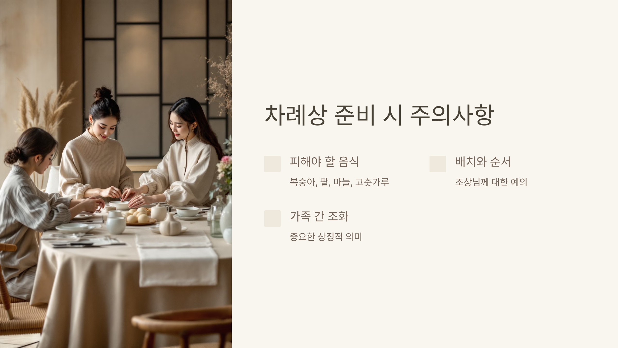 차례상을 준비할 때는 피해야 할 음식도 있습니다. 예를 들어, 복숭아나 팥, 마늘, 고춧가루가 들어간 음식은 차례상에 올리지 않는 것이 일반적입니다. 이는 조상님께 드리는 음식이기 때문에, 전통적으로 금기시되는 재료를 피하는 것이죠. 또한, 차례상을 차릴 때는 각 음식의 배치와 순서를 잘 고려해야 합니다. 이는 조상님께 드리는 예의이자, 가족 간의 조화를 상징하는 중요한 요소입니다.