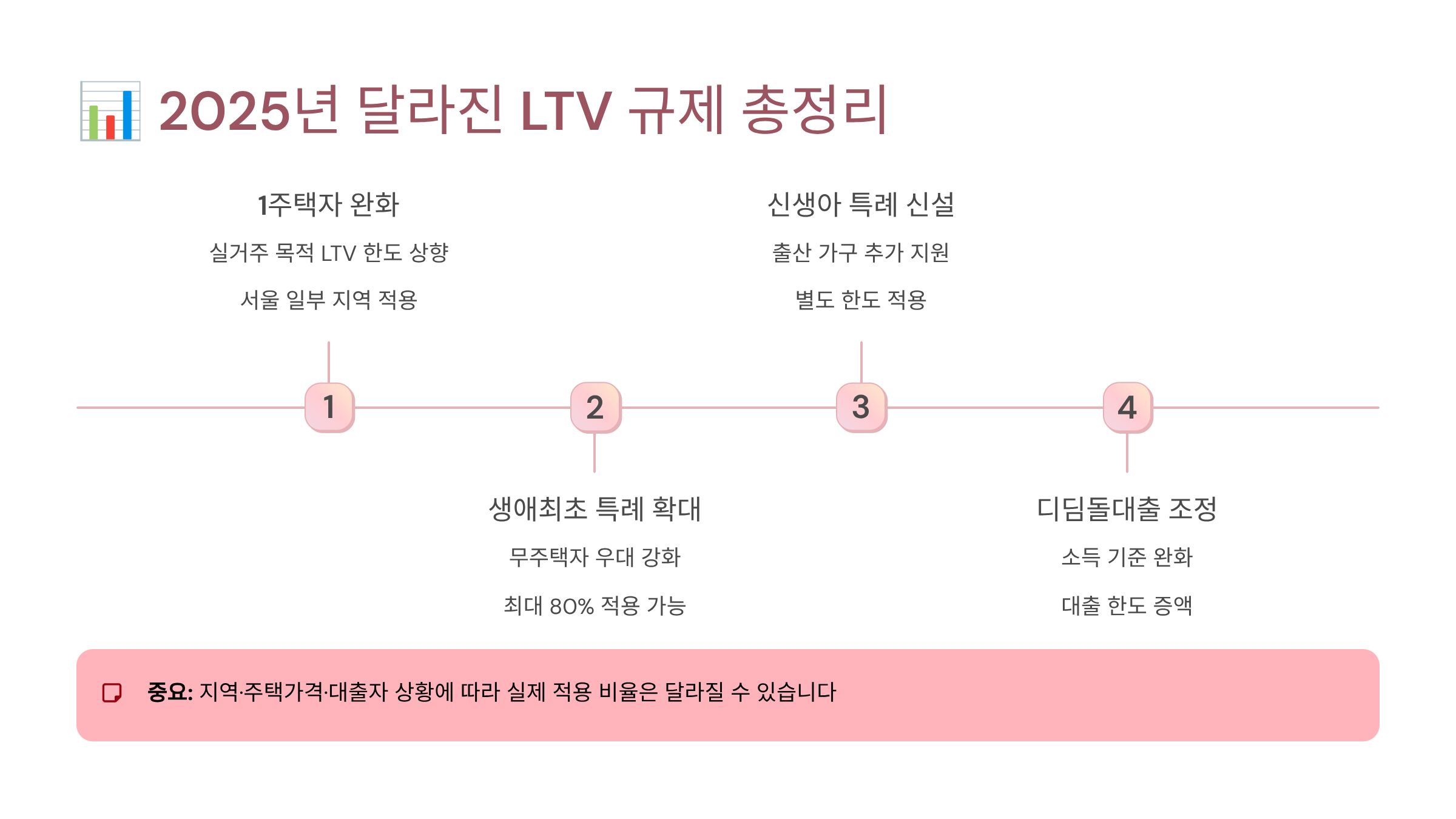 2025년 들어 LTV 규제에 큰 변화가 있었어요. 정부가 서민 주거 안정과 실수요자 보호를 위해 일부 완화 정책을 시행했지만, 투기 수요 억제 기조는 여전히 유지되고 있답니다. 특히 생애최초 구매자와 신혼부부에 대한 우대 폭이 커진 게 특징이에요.