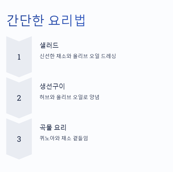 또한, 간단한 요리법을 활용하는 것이 좋습니다. 샐러드는 신선한 채소와 올리브 오일 드레싱으로 간단히 준비할 수 있으며, 생선구이는 허브와 올리브 오일로 양념하여 구워내면 맛있고 건강한 한 끼가 완성됩니다. 곡물 요리로는 퀴노아와 채소를 곁들인 요리를 추천합니다.