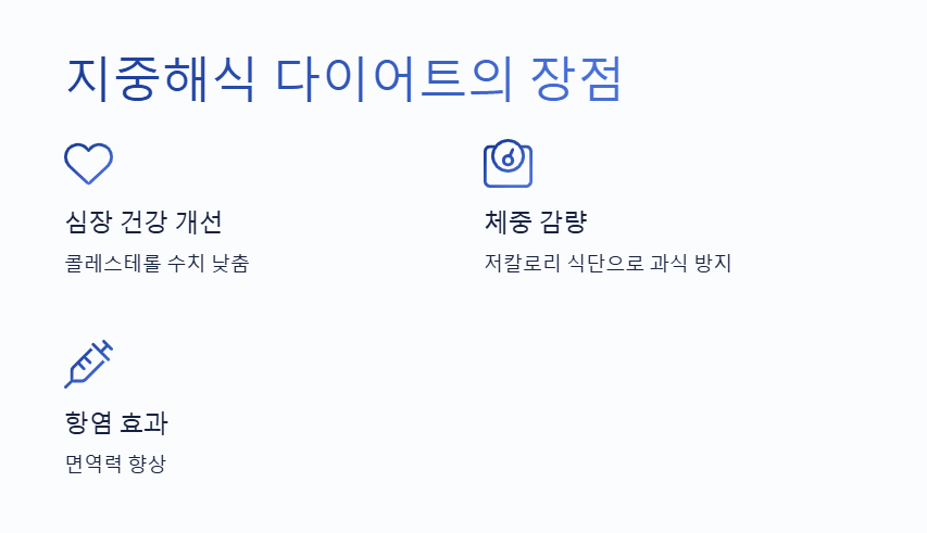지중해식 다이어트의 가장 큰 장점 중 하나는 심장 건강 개선입니다. 올리브 오일과 생선에 포함된 불포화지방산은 콜레스테롤 수치를 낮추고 심혈관 건강을 향상합니다. 이는 심장 질환 예방에 큰 도움이 됩니다. 또한, 자연식품 중심의 저칼로리 식단은 과식을 방지하고 체중 감량을 돕습니다. 항염 효과도 무시할 수 없습니다. 항산화 성분이 풍부한 채소와 과일은 염증을 줄이고 면역력을 높여줍니다. 이러한 식단은 장수와도 연관이 있으며, 장기적으로 건강한 삶을 유지하는 데 도움을 줍니다.