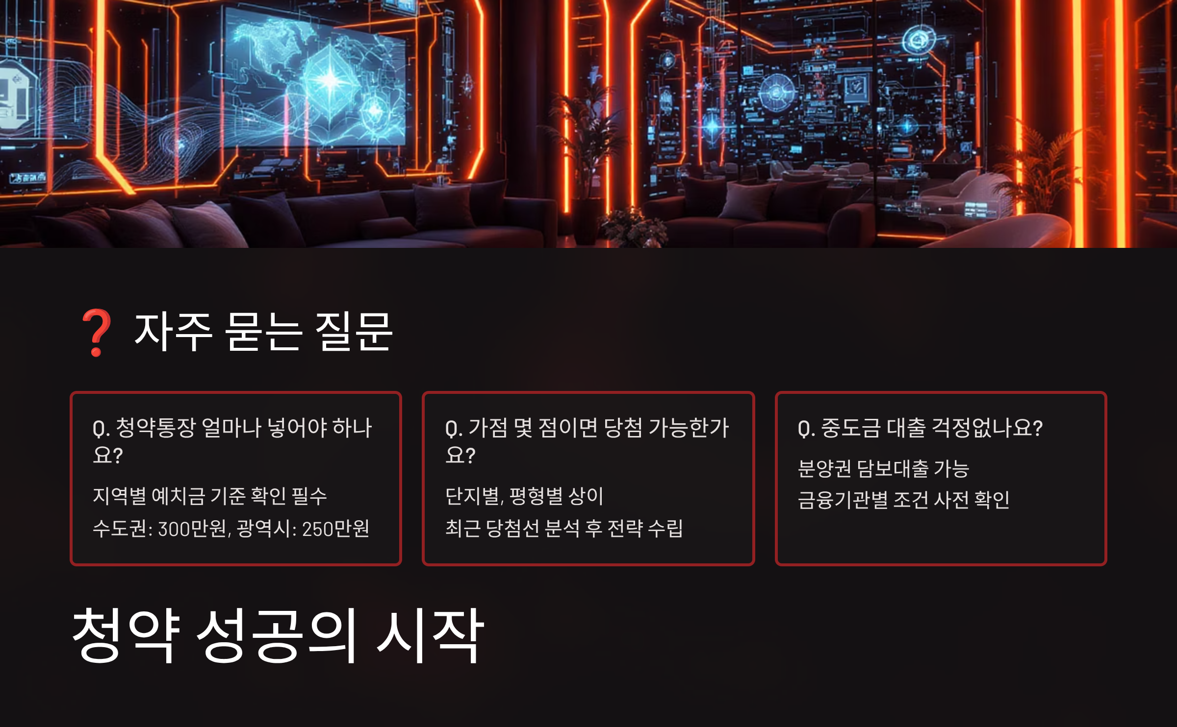 본 콘텐츠는 일반적인 정보 제공을 목적으로 작성되었으며, 개인의 특수한 상황을 고려한 맞춤형 조언이 아닙니다. 청약 관련 정책과 규정은 수시로 변경될 수 있으므로, 실제 청약 신청 시에는 반드시 최신 공고문과 관련 기관의 공식 안내를 확인하시기 바랍니다. 본 정보를 활용한 의사결정에 따른 결과에 대해서는 독자 본인의 책임이며, 필요시 전문가의 상담을 받으시길 권장합니다.