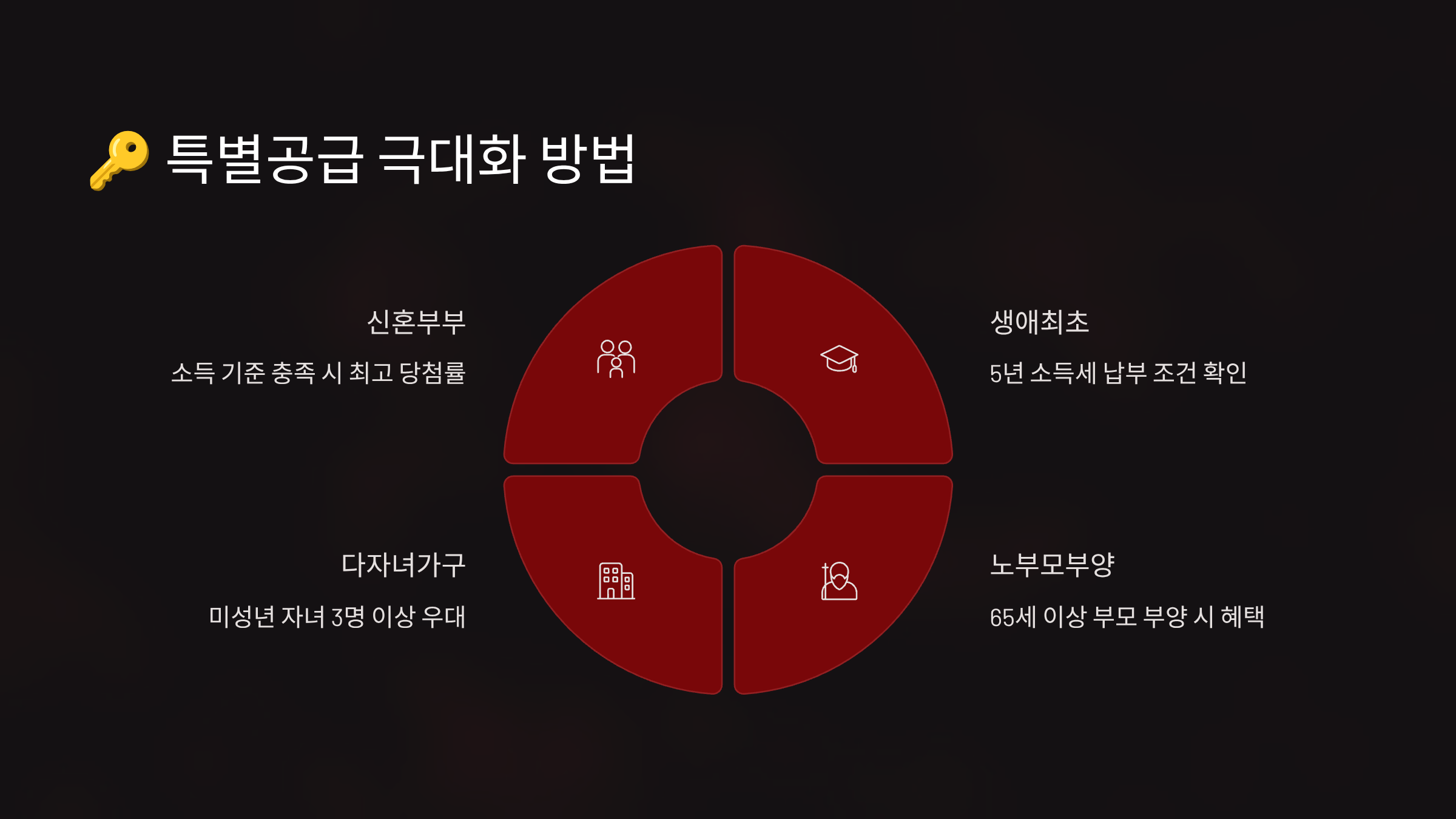 특별공급은 일반공급보다 경쟁률이 낮고 자격 요건만 충족하면 당첨 가능성이 높아요. 전체 분양 물량의 약 50~60%가 특별공급으로 배정되는데, 신혼부부, 생애최초, 다자녀, 노부모부양, 기관 추천 등 다양한 유형이 있어요. 각 유형별로 자격 요건과 선정 방식이 다르니 자신에게 맞는 특별공급을 찾는 것이 중요해요.