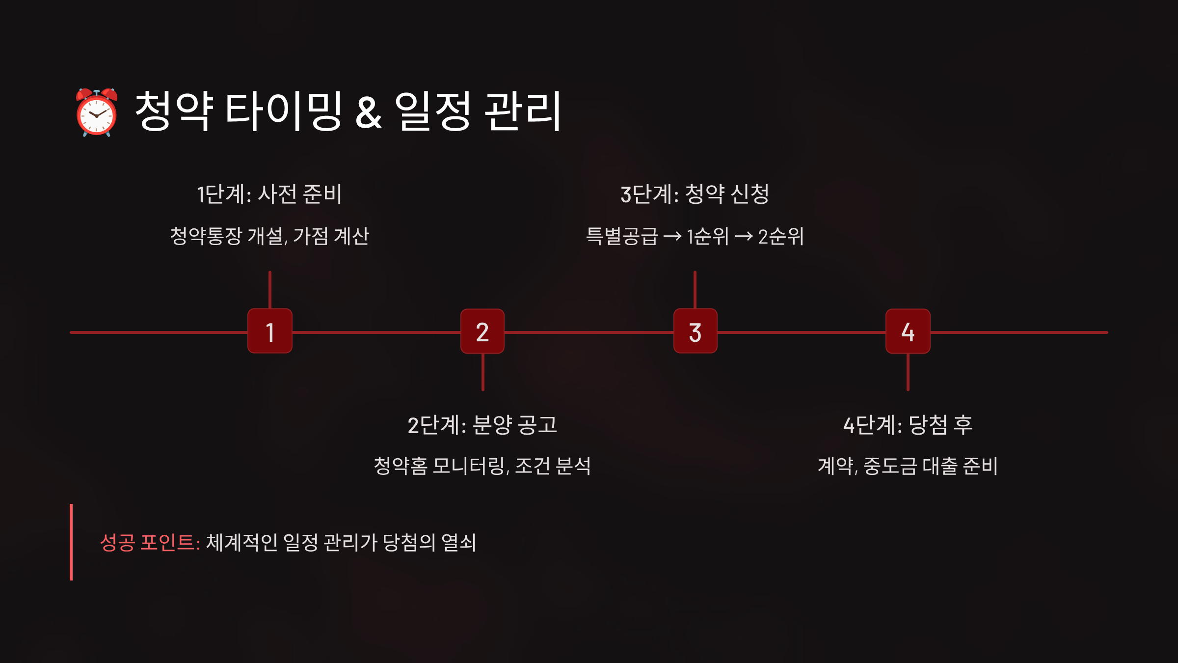 장기적인 청약 캘린더를 만들어 관리하는 것도 좋은 방법이에요. 관심 지역의 분양 예정 단지들을 정리하고, 각 단지별로 예상 경쟁률과 자신의 당첨 가능성을 분석해 보세요. 이렇게 체계적으로 준비하면 충동적인 청약 신청을 줄이고 전략적으로 접근할 수 있어요. 청약은 한 번의 기회가 중요하니 철저한 준비가 필수랍니다! ⏱️