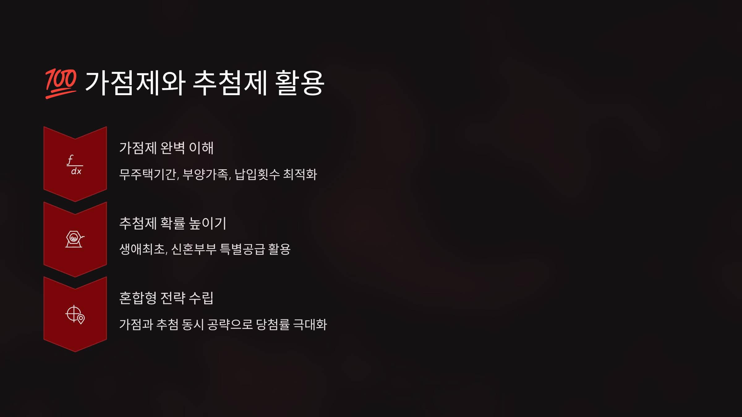 가점제와 추첨제를 동시에 노리는 전략도 있어요. 예를 들어 부부가 각자 청약통장을 가지고 있다면, 가점이 높은 쪽은 가점제 물량을, 가점이 낮은 쪽은 추첨제 비율이 높은 대형 평형을 노려볼 수 있어요. 이렇게 하면 당첨 확률을 두 배로 높일 수 있답니다.