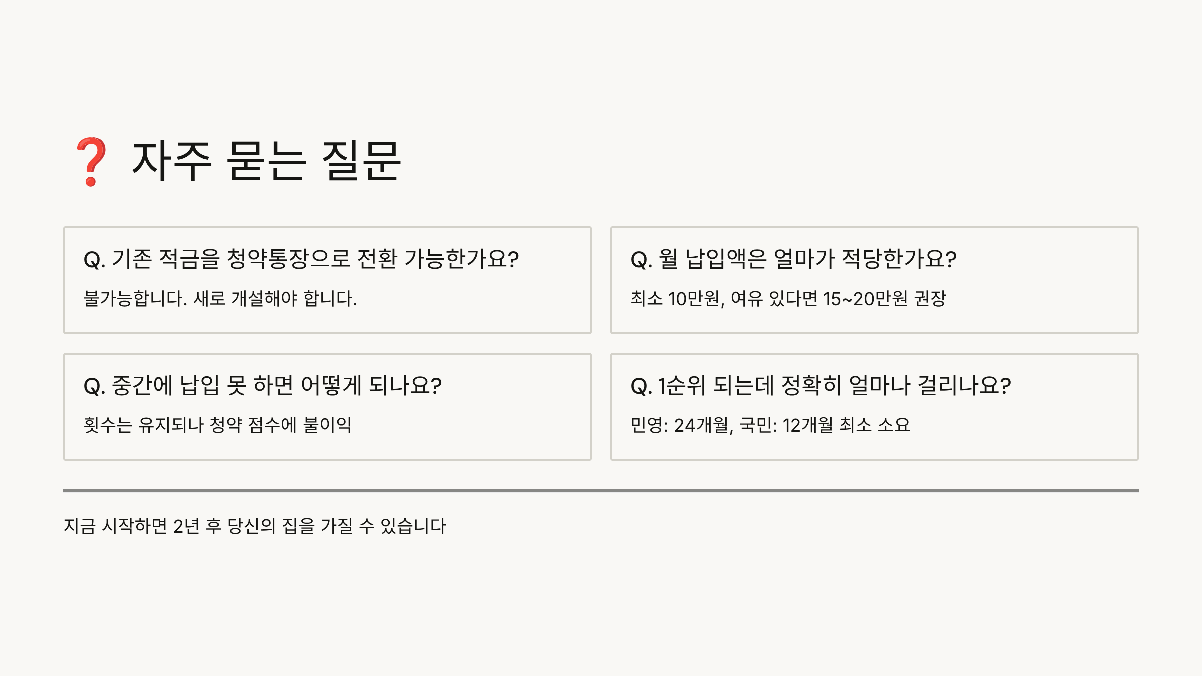 청약통장 1순위 자격은 내 집 마련의 가장 확실한 첫걸음이에요. 시세보다 저렴한 분양가로 아파트를 구입할 수 있는 기회가 열리고 전세난과 월세 부담에서 벗어날 수 있어요. 매월 10만 원씩 꾸준히 납입하면 재테크 효과와 소득공제 혜택까지 누릴 수 있답니다. 가입 기간이 길수록 가점이 높아지기 때문에 하루라도 빨리 시작하는 게 유리해요. 청약 당첨은 운이 아니라 준비된 자에게 오는 기회예요. 지금 바로 청약통장을 개설하고 내 집 마련의 꿈을 향해 첫 발을 내디뎌보세요.