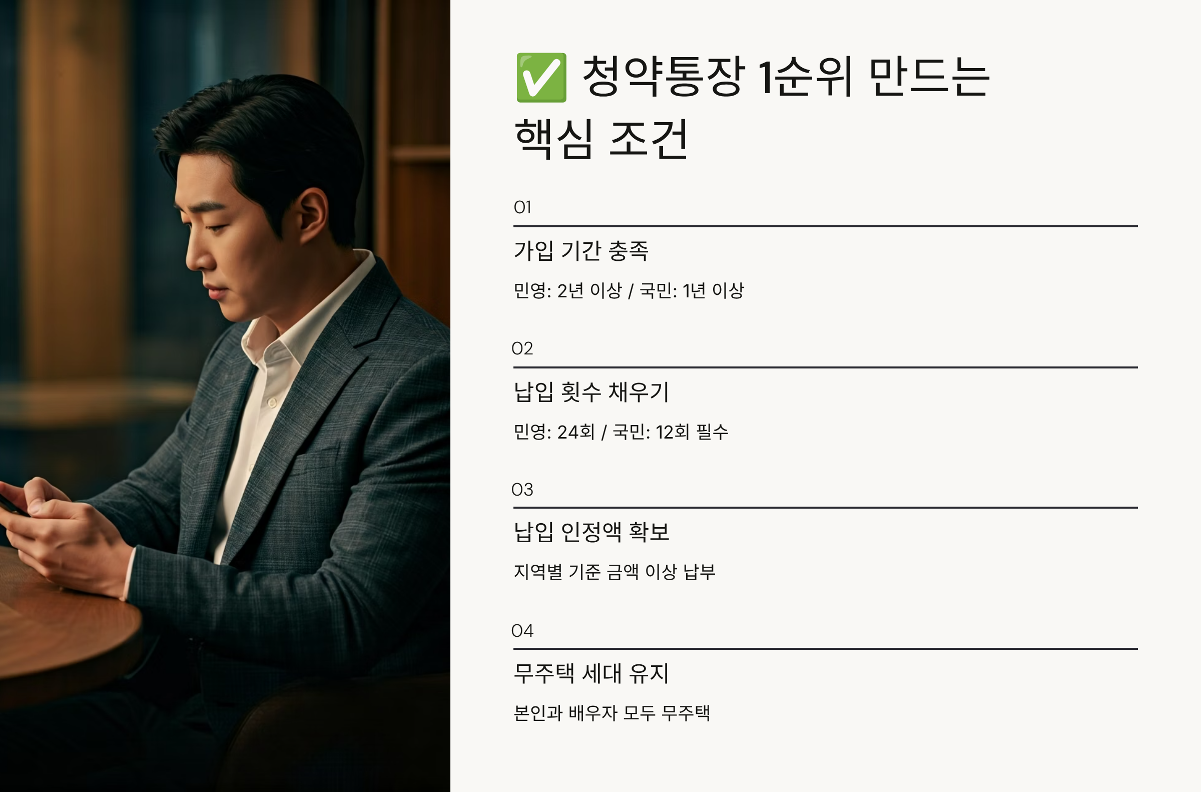 내가 생각했을 때 청약통장만큼 확실한 내 집 마련 수단은 없어요. 로또보다 현실적이고 적금보다 혜택이 크니까요. 지금부터 1순위 조건을 완벽하게 정리해 드릴게요.