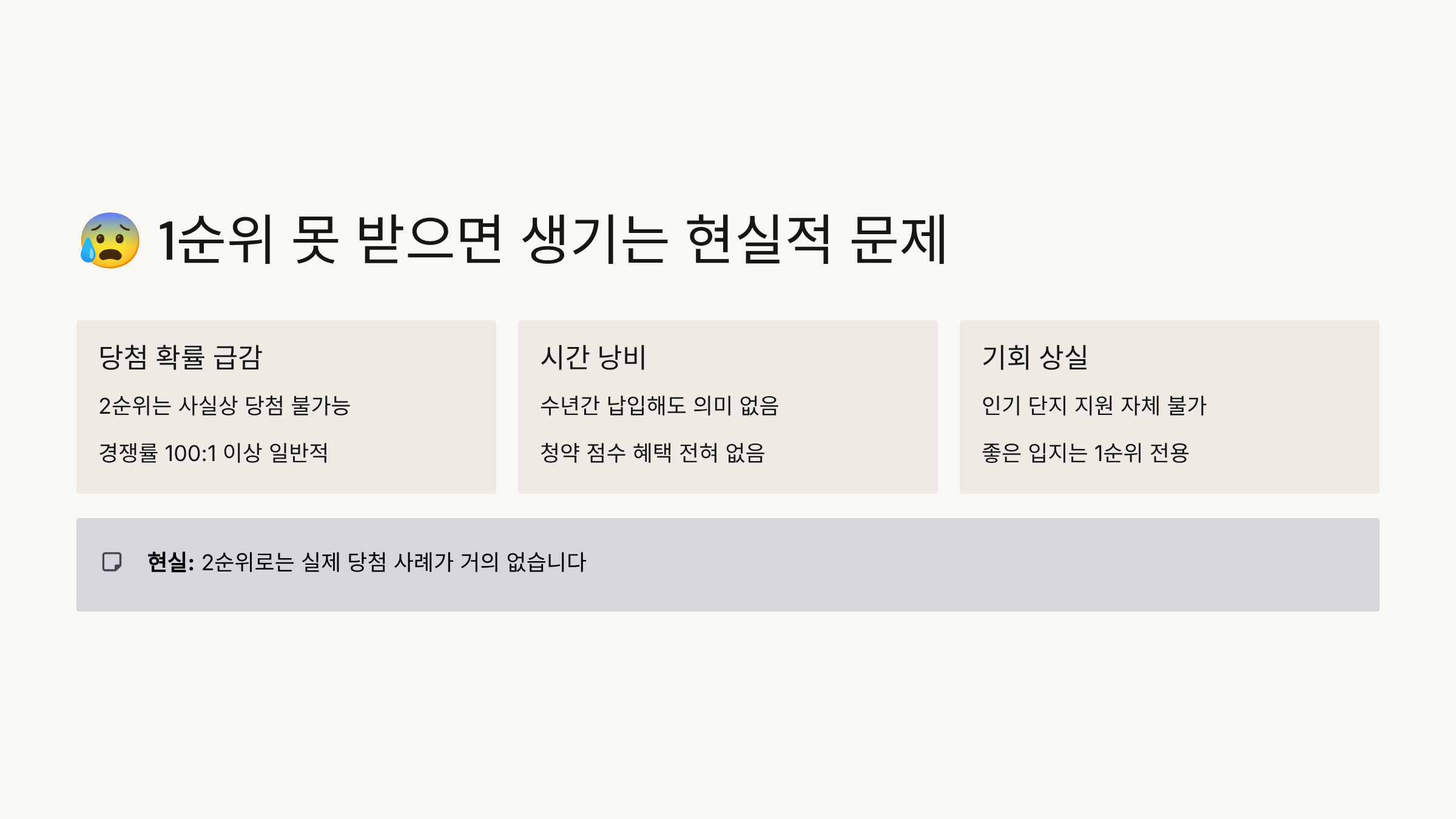 청약 2순위로 밀리면 사실상 당첨 가능성이 제로에 가까워요. 인기 단지는 1순위에서 수십 대 1의 경쟁률을 보이는데 물량이 남아 2순위로 내려오는 경우가 거의 없어요.