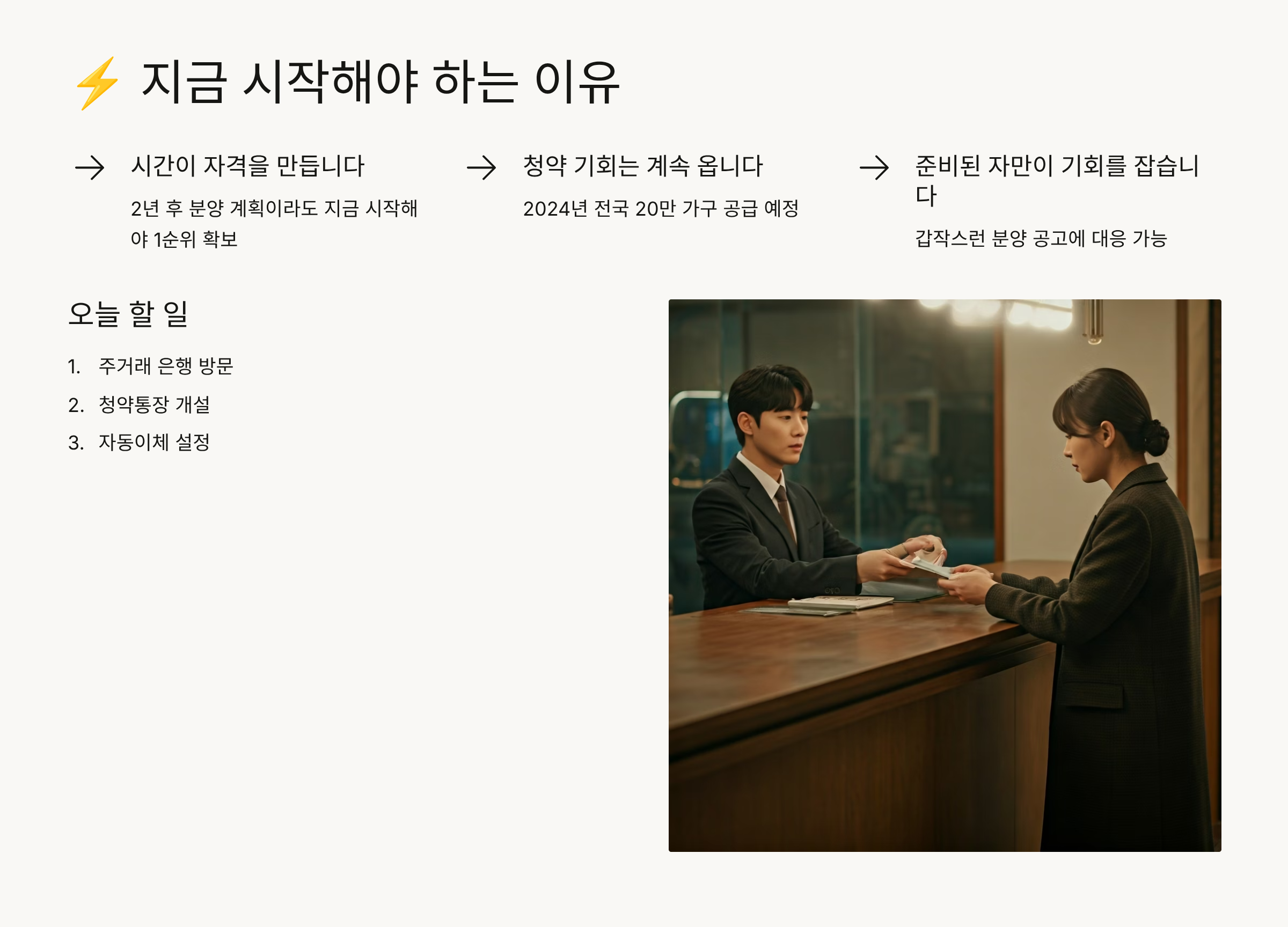 지금 당장 시작하지 않으면 내년에 후회할 수 있어요. 1년의 차이가 10년의 격차를 만들 수 있는 게 청약이에요.