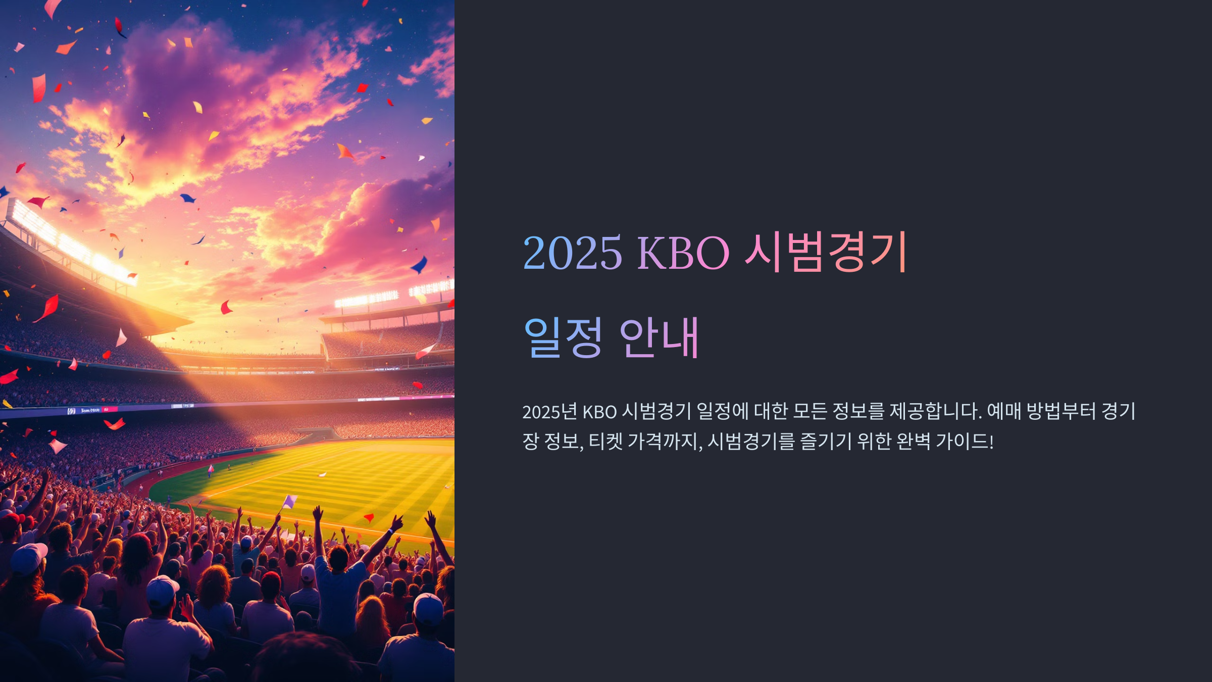 2025 KBO 시범경기는 팬들에게 정규 시즌 개막 전 선수들의 경기력을 미리 확인할 수 있는 좋은 기회예요. 예매 일정과 경기 정보를 확인하고 즐겁게 관람하세요.
